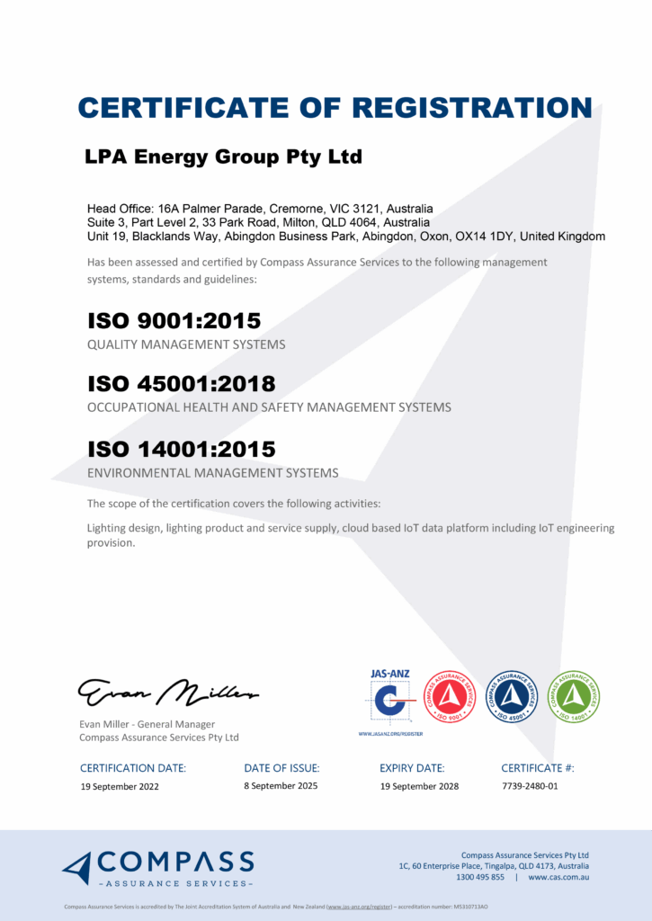 At LPA, we are committed to our brand values. We strive to provide quality services and contribute to a greener future. To demonstrate this commitment to all of our partners, we have successfully been re-certified for ISO accreditation for Quality (ISO 9001), Environmental (ISO 14001) and Safety (ISO 45001) for LPA Energy Group in Australia and the UK.